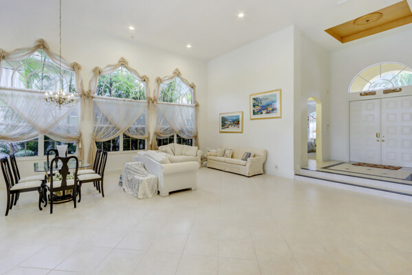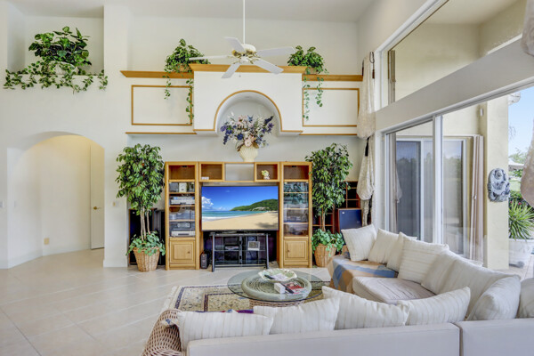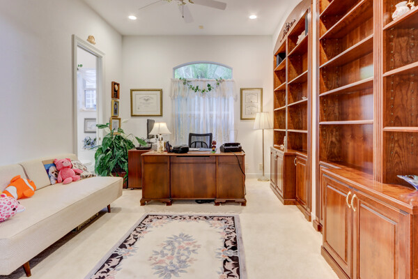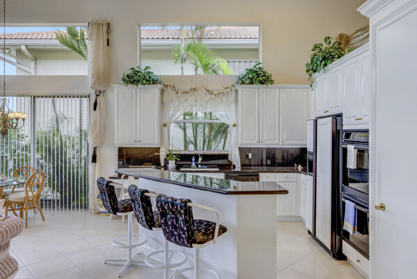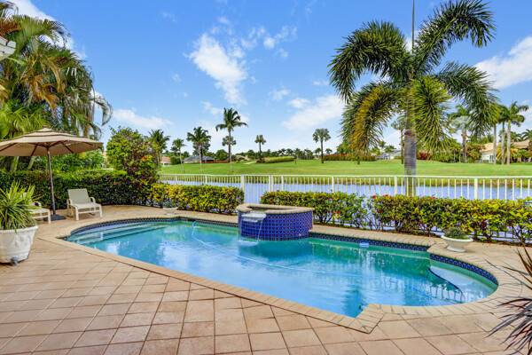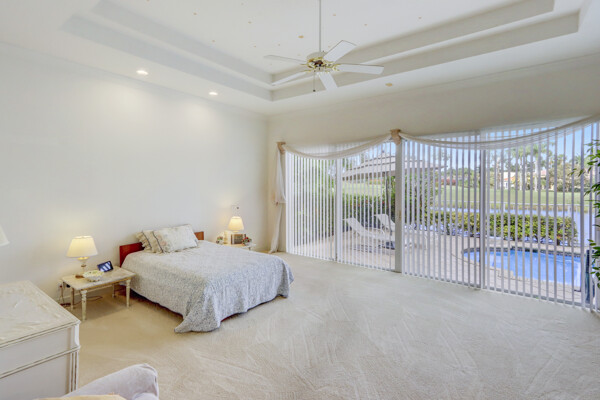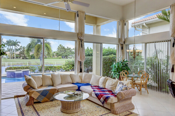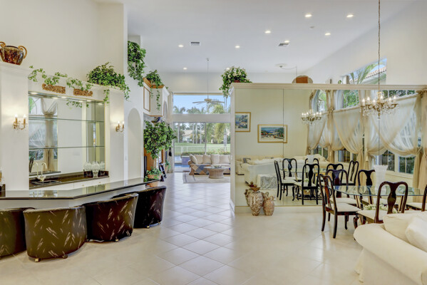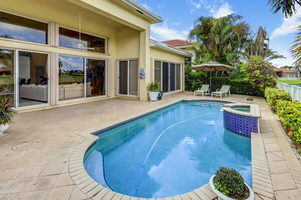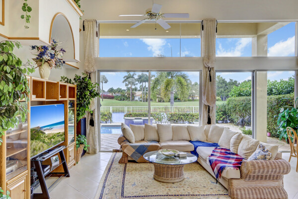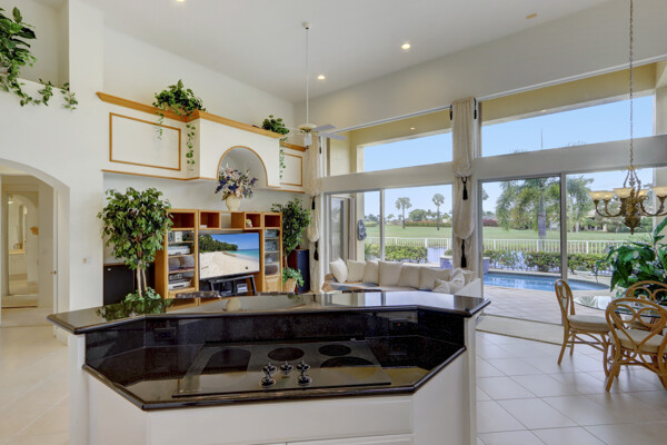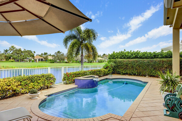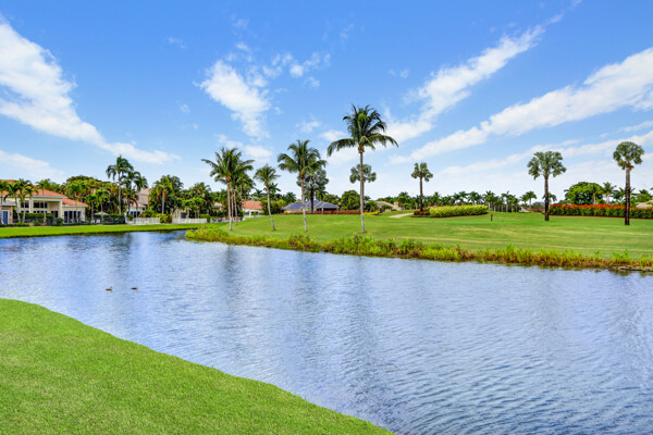 Very special lake & golf course views fill this light, bright and cheery 1-story home of 3 bedrooms & 3 baths offering an open floor plan which features volume ceilings with LED high-hat lighting; neutral tile laid on the diagonal & beige carpeting; an open kitchen with white high-gloss cabinetry & granite countertops; a built-in Living Room wet bar & built-ins in the library/third bedroom; central vacuum system; tile garage floor; accordion hurricane shutters; 2-zone A/C about 4 years. Sliding glass doors open to the inviting patio with a pool overlooking the lake and 8th & 9th holes of the golf course. Relax & enjoy watching the golfers from far away enough not to have any golf balls!