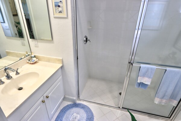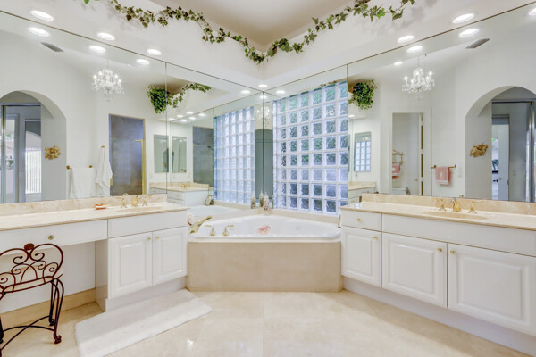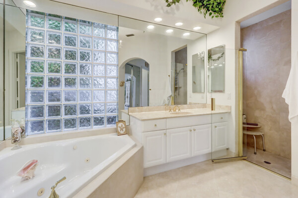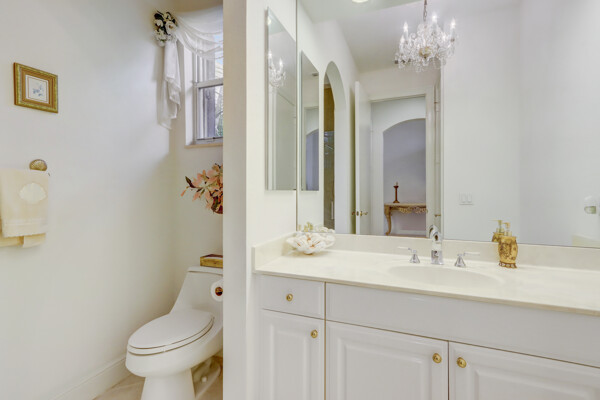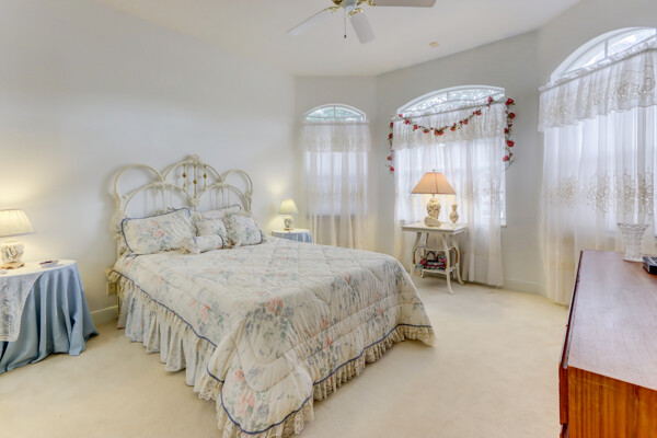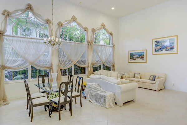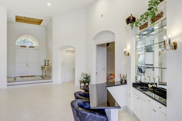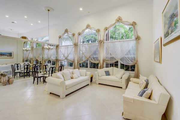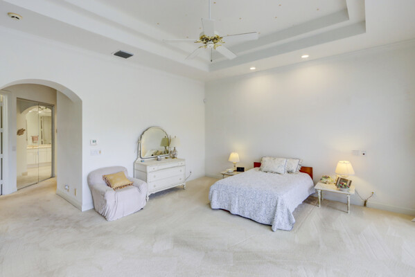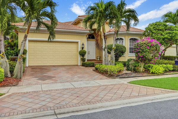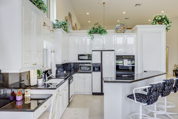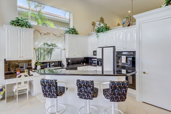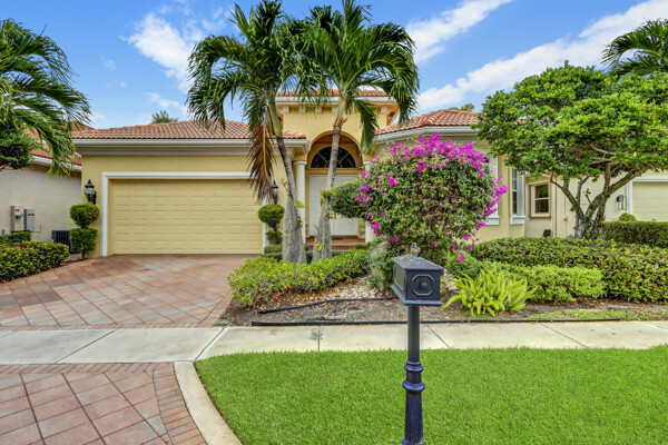 Very special lake & golf course views fill this light, bright and cheery 1-story home of 3 bedrooms & 3 baths offering an open floor plan which features volume ceilings with LED high-hat lighting; neutral tile laid on the diagonal & beige carpeting; an open kitchen with white high-gloss cabinetry & granite countertops; a built-in Living Room wet bar & built-ins in the library/third bedroom; central vacuum system; tile garage floor; accordion hurricane shutters; 2-zone A/C about 4 years. Sliding glass doors open to the inviting patio with a pool overlooking the lake and 8th & 9th holes of the golf course. Relax & enjoy watching the golfers from far away enough not to have any golf balls!